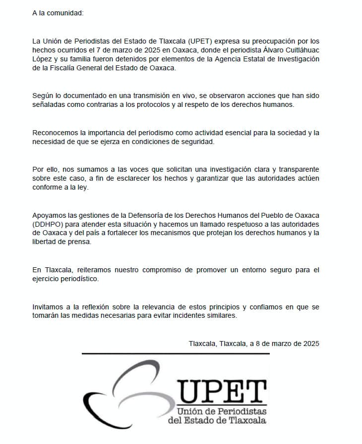 La UPET reafirma su compromiso con la defensa de la prensa local y hace un llamado a las autoridades estatales y federales โincluyendo la Comisiรณn Estatal de Derechos Humanos (CEDH) para que investiguen estos hechos y garanticen la seguridad de los periodistas.