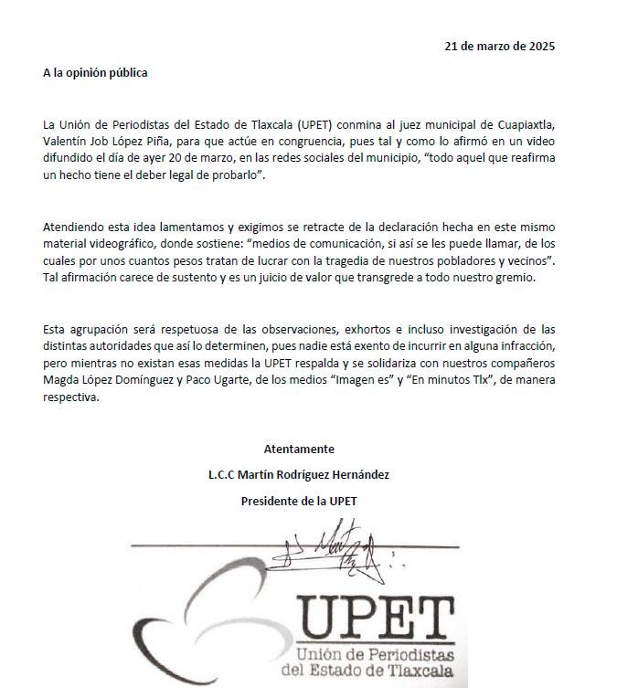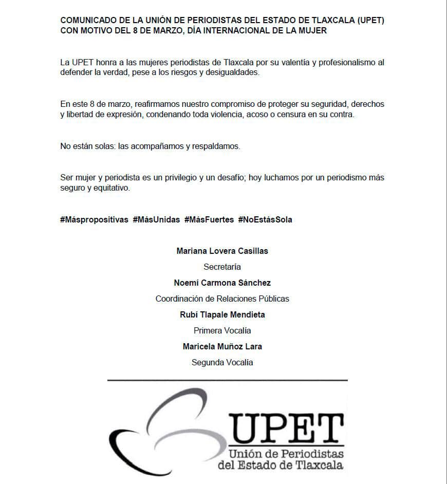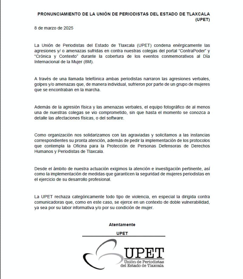 La Uniรณn de Periodistas del Estado de Tlaxcala (UPET) expresa su respaldo y solidaridad a los comunicadores de los medios locales que este 11 de septiembre de 2025 sufrieron una agresiรณn fรญsica directa de parte del equipo del presidente municipal de Mazatecochco, Emilio Gonzรกlez Cortรฉs, durante el intento legรญtimo de ejercer su labor periodรญstica frente al Palacio de Gobierno de Tlaxcala.