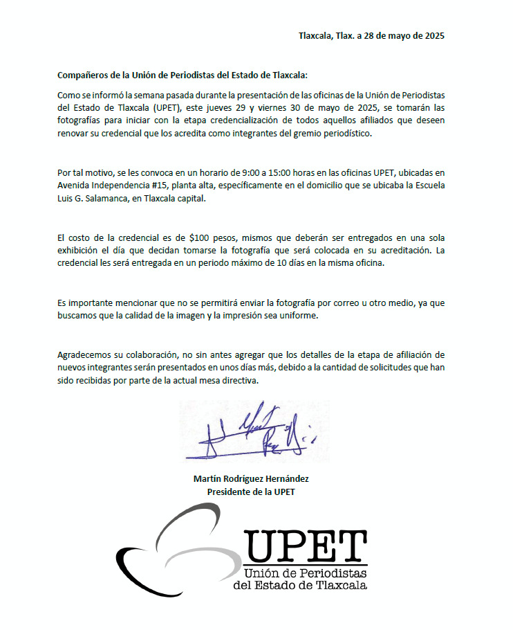 Esta convocatoria responde a la solicitud del gremio para abrir una nueva etapa de afiliaciรณn a la Uniรณn de Periodistas del Estado de Tlaxcala, fortaleciendo su compromiso con el periodismo profesional y รฉtico.